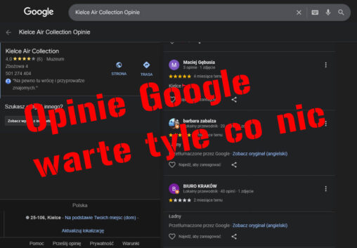 Cieszę się że Google zauważyło moje muzeum Kielce Air Collection. Ale ze zdziwieniem zauważyłem, że przy Muzeum są gwiazdki, i nawet by mnie to cieszyło gdyby nie dwa…