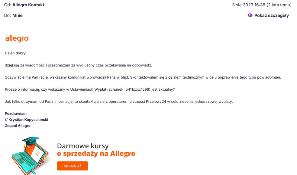 Kłamią w komunikatach, kłamie Pan Krystian, że ok, Allegro popełniło błąd, że jednak odda pieniądze (Pan Krystian pisał „Proszę o informację, czy wskazany w Ustawieniach Wypłat rachunek (5411xxxx1596) jest aktualny?  Jak tylko otrzymam od Pana informację, to skontaktuję się z operatorem płatności Przelewy24 w celu zlecenia jednorazowej wypłaty’) mijają lata, pieniądze tracą na wartości, a Allegro dla 500 zł kłamie, kłamie, kłamie…