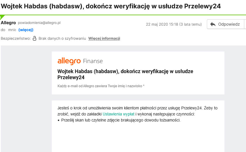 Więc wprawdzie dostałem w maju 2020 roku informację, i zaproszenie bym dokończył weryfikację w usłudze Przelewy24.