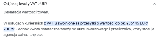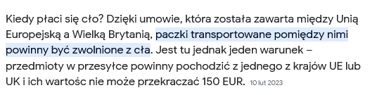 Jeśli wierzyć informacjom zawartym w internecie, jeśli wartość przedmiotu importowanego z Anglii nie przekracza odpowiednio 150 i 36 funtów, opłaty za taką przesyłkę wynoszą równe 0.