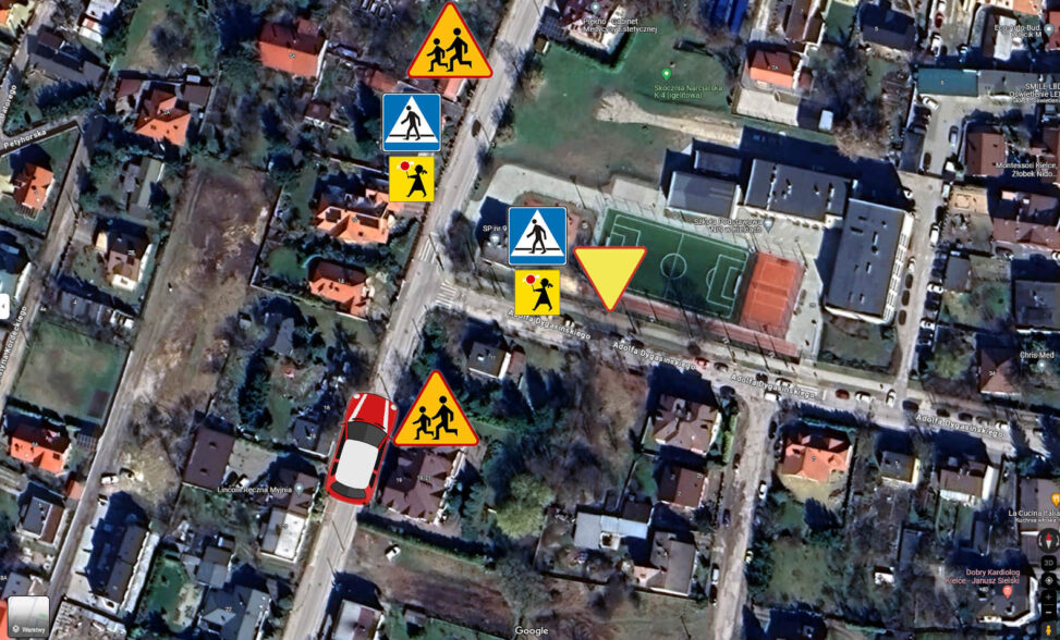 (mapka z odwzorowaniem oznakowania które jest umieszczone w pobliżu skrzyżowania)