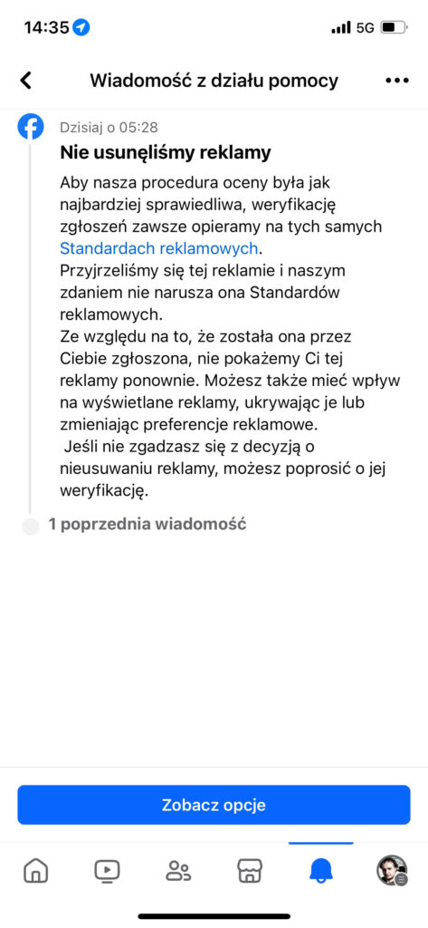 Standardem reklamowym Facebooka, jest wpuszczanie ludzi w maliny, i narażanie ich na straty finansowe. To właściwie napisali „Przyjrzeliśmy się tej reklamie i naszym zdaniem nie narusza ona Standardów reklamowych”.